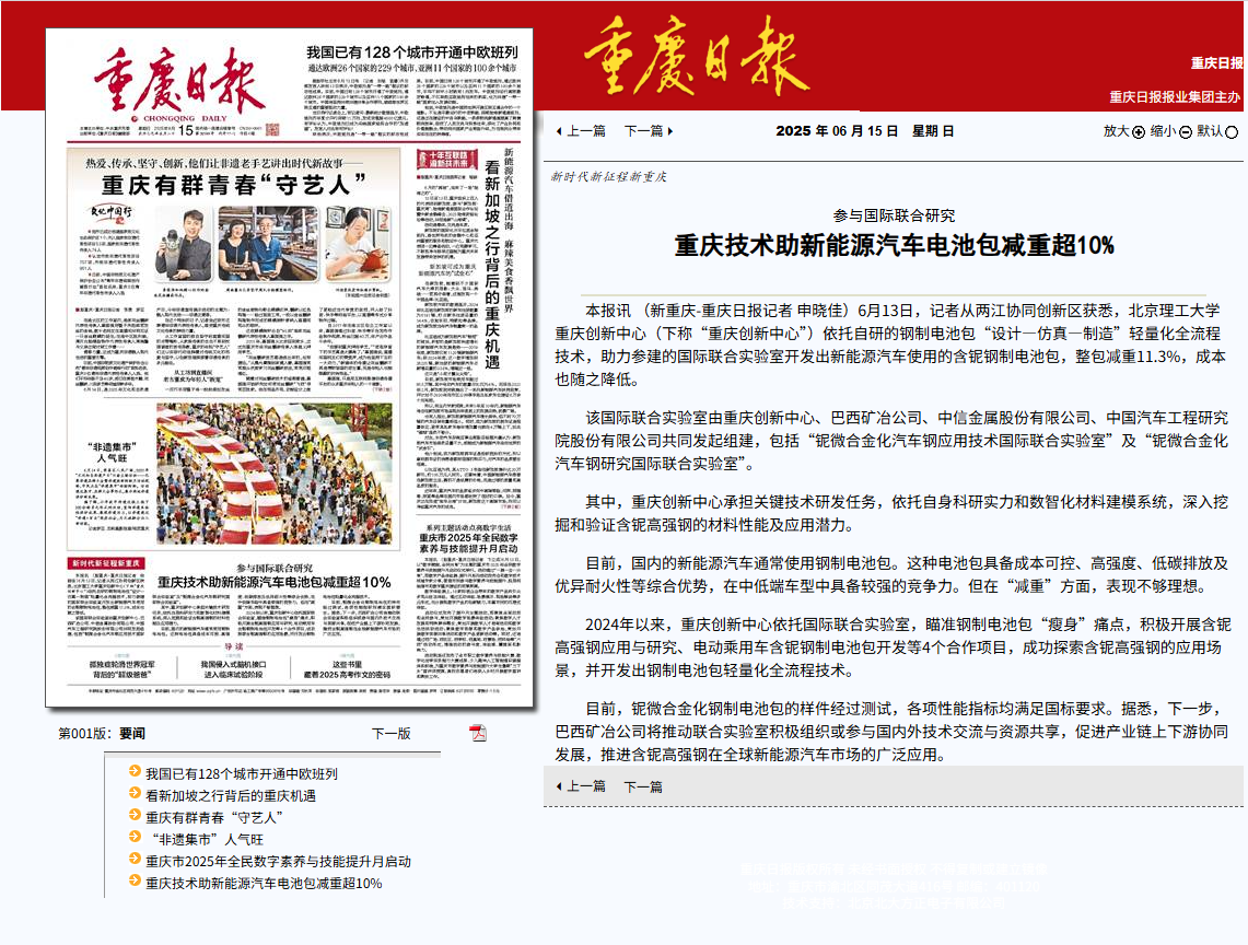 参与国际联合研究 重庆技术助新能源汽车电池包减重超10%